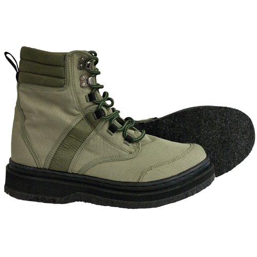 The Frogg Toggs Rana Canvas Felt Sole Wading Shoe features a 1200 denier polyester canvas upper for tough durable protection. This shoe also features an internal semi-hard toe cap for added protection for the toes and a reinforced ankle area for support. The one-piece full felt sole aids in traction on slick rocks and stream beds. A heavy-duty reinforced speed lace system makes for easy in and out. Shoes come in a New Sage color with Black felt soles. Available in mens sizes 7 through 13.